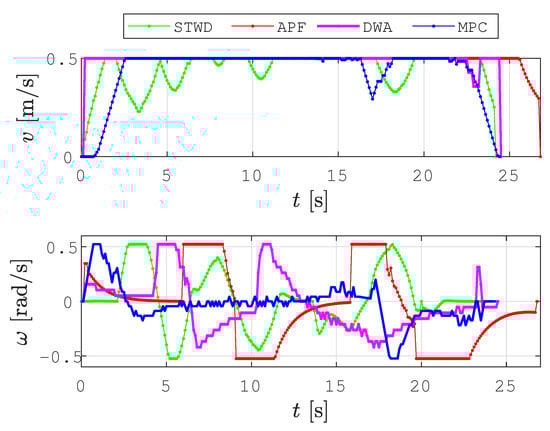 The results of the comparison of the STWD*, APF, DWA, and MPC algorithms are given in Table 3. The proposed method has a shorter travel trajectory and a reduced execution time compared to the results obtained with other methods. APF has the longest travel trajectory, and the robot did not reach the goal but only entered the vicinity due to the goal-nonreachable-with-an-obstacle-nearby (GNRON) problem. Average curvature was the highest for MPC because the robot rotated in place in the starting position (see Figure 14 blue line). DWA had the lowest curvature along the path. MPC outperformed the other methods in terms of average acceleration because it found the optimal controls over a prediction horizon by minimizing the navigation function computed from the D* path. The other algorithms yielded similar average acceleration values. The initial path planning with the proposed method was high because the TWD* algorithm performs two D* discrete graph searches and calculates the shortest path within the area of minimal path costs, which are computationally more demanding compared to the other local path-planning methods. APF yielded the lowest initial path-planning values from the start to the goal.