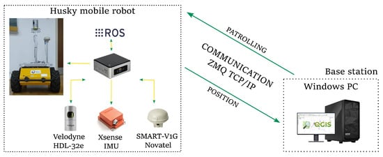 The experiments (the smooth autonomous patrolling experiments are shown in the accompanying video available here https://youtu.be/9F-SzTUmzjo (accessed on 18 August 2023)) were conducted on a system (illustrated in Figure 15) consisting of a Husky mobile robot and a base station. The Husky mobile robot is equipped with an Intel NUC7i7BNH, the SMART-V1G Novatel integrated L1 GPS + GLONASS receiver and antenna, Xsense IMU, and Velodyne HDL-32e LiDAR. The NUC runs Linux Ubuntu 16.04 and it consists of an i7 CPU and 2x8GB of DDR4 RAM. Velodyne HDL-32e was used for map building, and GPS was employed to provide a precise global position in an outdoor environment. IMU was used for orientation estimation for all three axes (yaw, pitch, and roll). The base station consists of one PC equipped with an i7 CPU and 16 GB of RAM. The PC ran on Windows 10 and was used for assignments and monitoring missions based on QGIS.