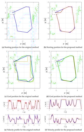 The linear velocity of the robot never drops below m/s, which can be seen in the velocity profile in Figure 16f. The robot tracked the trajectory with continuous motion without stopping. This is an advantage over the original method, where the robot stops at each goal on the patrolling route (see Figure 16e).