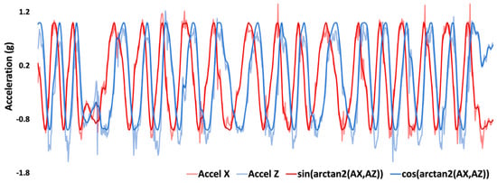 The raw Accelerometer X (red) and Z (blue) shown with the superimposed wheel orientation estimates developed by using the two-argument arctangent function.