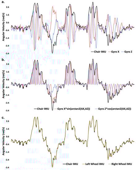 In order to determine the component of wheelchair angular velocity measured by each gyroscope axis, each axis signal was multiplied by the orientation of the axis determined from the respective accelerometer axes in the previous step. The result determined the component of the resultant transverse (wheelchair frame) rotation occurring in each gyroscope axis. Summing the result from each axis returned the resultant wheelchair frame rotation derived from the wheel-mounted IMU (Figure 4).
