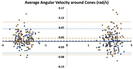 The Bland–Altman plot demonstrates minimal bias and small limits of agreement for average angular velocities during left and right turns in an agility test for both left and right wheel-mounted IMU angular velocity estimates (Figure 5). There was a mean difference of 0.002 rad/s with limits of agreement of 0.064 rad/s and −0.059 rad/s for the right wheel IMU and a mean difference of 0.016 rad/s and limits of agreement of 0.10 rad/s and −0.067 rad/s for the left wheel IMU.