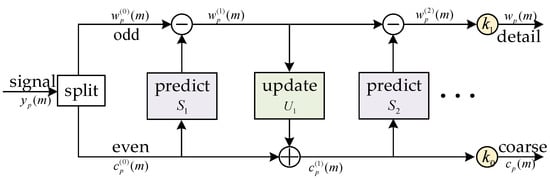 The decomposition process of the p-th layer is shown in Figure 2. The lifting wavelet mainly uses prediction and update to decompose the original signal. and represent the high-frequency sub-band and low-frequency sub-band coefficients of lifting wavelet decomposition, respectively. First, the signal is divided into even sequence and odd sequence , where represents the decomposition number of the layer, and then the repeated prediction and updating processes are conducted to complete the wavelet decomposition. Both and can be initialized separately using and , respectively. In terms of prediction, can be predicted by using a prediction operator and , which can be expressed as