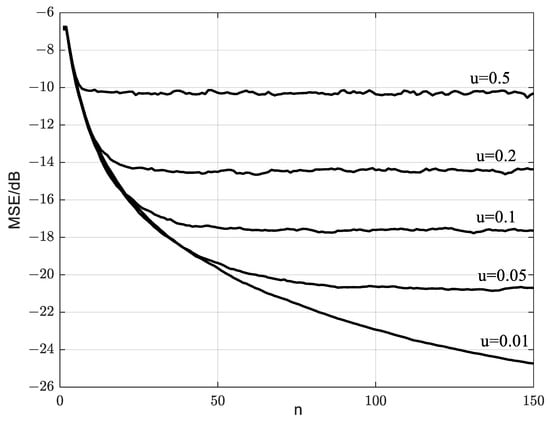 To discuss the convergence of the method, it is first assumed that the secondary users are stationary and have the same nominal noise variance of . The simulation parameters are , , , and . Figure 4 shows the MSE for SNR estimations vary with different iteration times of . It can be seen that the smaller MSE is obtained if the smaller is chosen as the iteration time of is increased. Clearly, a smaller allows the historical data to be more thoroughly trained and it will slow down the convergence speed. In addition, since too small will lead to over-learning of history data, it will not further enhance the detection performance by blindly reducing the value of . Through considering the compromise between the convergence speed and the estimated performance, is selected for subsequent simulation.