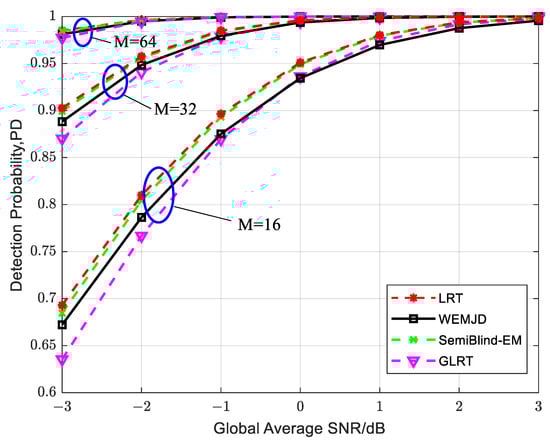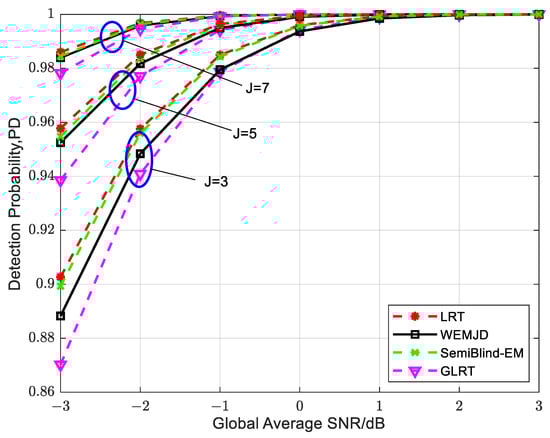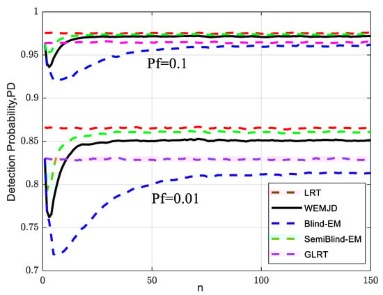 To observe the sustained performance of the method, the simulation parameters are set as , , , and . As shown in Figure 7, the detection probability increases as the SNR increases. It can also be observed that the detection performance continuously improves as the sample size of increases with the same SNR. Moreover, the difference in detection probability between the WEMJD and SemiBlind-EM gradually becomes larger as the sample size of decreases. It can be interpreted that the estimation performance of the proposed WEMJD method will be degraded as the noise variance estimation becomes poorer as the number of sample points used becomes smaller.