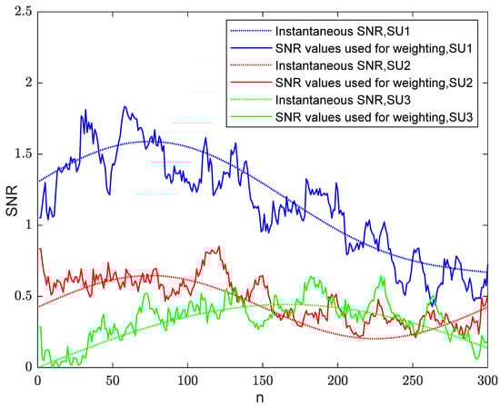 By taking account of the scenario of changing channel conditions, it is assumed that the SUs exhibit mobility, which means that the received SNR at the SUs changes over time. In the presence of and , the estimated SNR for each user using the WEMJD method is shown in Figure 6. It can be seen that the estimated value does not conform to the change law of instantaneous SNR at the beginning. When the required number of iterations is reached, the WEMJD can effectively track and estimate the instantaneous SNR of each user’s received signal.