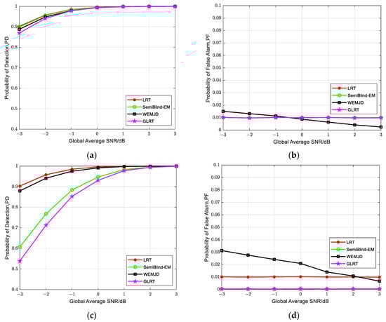 It may be noted that the false alarm probability of the proposed method fluctuates around the set value as the global average SNR is varied, which is shown in Figure 9b. When the SNR is greater than −0.5 dB, the actual false alarm probability of WEMJD is less than the set value of 0.01, conversely, when , the actual false alarm probability exceeds 0.01. The observed phenomenon can be attributed to the fact that at high SNR, the noise variance estimates increase, causing the SNR estimate in (31) to descend. Consequently, the weighting coefficient in (37) of each user decreases, which will lead to a lower false alarm probability compared to the predetermined threshold value. On the contrary, the will become higher at a smaller SNR. For safety considerations, we adopted to obtain a lower decision threshold. Therefore, in the presence of noise uncertainty, the actual false alarm probability of the SemiBlind-EM and GLRT is less than 0.01 in Figure 9d. Moreover, by comparing Figure 9b,d, it can be seen that the false alarm probability of WEMJD has increased as noise uncertainty exists. Comparing Figure 9a,c, this increase in false alarm probability can be seen as sacrificing a certain level of false alarm probability to maintain the detection probability.