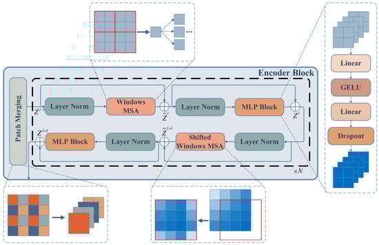 The encoder block is the basic module of HWT, which is composed of several function blocks. The structure of the encoder block includes a patch merging block and a stackable MSA block, as shown in Figure 1. Two types of MSA modules make up the attention mechanism block: Windows-based MSA (W-MSA) and shifted windows-based MSA (SW-MSA). Each MSA module is followed by a multi-layer perceptron (MLP) module, and the layer normalization (LN) and the residual connector are applied in each module.