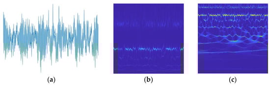 Improved SWT implementation process. (a) is the time domain plane of the vibration signal, (b) is the time-frequency plane according to the standard SWT, and (c) is the time-frequency plane according to the improved SWT proposed in this work.