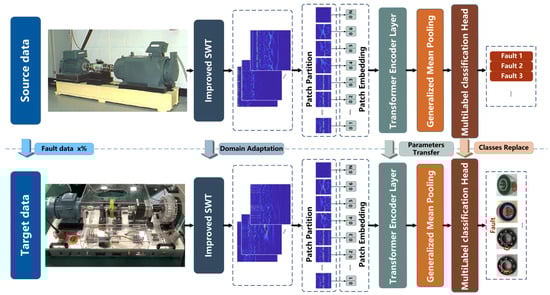 Recently, deep transfer learning (DTL) has been used in the fault diagnosis of RM to overcome the overdependence on the original samples [], which is realized by transferring the knowledge from the source domain (SD) to the target domain (TD). In general, DTL can be divided into three patterns: instance-based transfer, feature-based transfer, and parameter-based transfer (PTL) []. The first two methods assume that the samples or learned features of SD and TD have a similar distribution. Liu et al. [] proposed selective multiple instance transfer learning, which measures the correlation between tasks in the source and target domains by investigating the similarity of features between two tasks. This method solves the problem of knowledge security transfer in multi-instance learning. Wang et al. [] constructed a domain-adaptive transfer learning network by minimizing the maximum mean discrepancy between source and target domains to reduce marginal distribution bias. For the above methods, it is difficult to develop an algorithm with generalization ability to reduce the feature differences between different domains. In comparison, PTL has a wider range of applications and ensures user data privacy and security. In the PTL strategy, the feature extraction backbone of DL is applied to SD for training to obtain the pre-training backbone, and then the pre-training backbone containing the trained weight parameters is applied to TD. Data sharing is not involved in the process of knowledge transfer. Zhang et al. [] proposed federated transfer learning based on prior distribution, which achieves local fault diagnosis for multiple users by uploading local models and downloading global models. Chen et al. [] used a one-dimensional convolutional neural network (CNN) as the feature extraction backbone to implement parameter transfer to bearing and motor datasets. Wen et al. [] used the image of the bearing vibration signal from the time domain as input to train the pre-training model of ResNet-50 from ImageNet []. Although CNN and its numerous variants have achieved great success in PTL, the important features cannot be considered due to the limitations of convolutional layers and uniform feature consideration. With the success of the vanilla transformer [] in natural language processing (NLP) and computer vision (CV), it began to be used in DTL as an excellent backbone for feature extraction. Pei et al. [] used a vanilla transformer as a feature extraction backbone and CNN as a classifier to improve fault diagnosis from multiple classes to a few classes on bearing and gearbox datasets, respectively. In the current study, the vanilla transformer is more successful in fault diagnosis with balanced data. Ding [] combines time-frequency signal analysis with vanilla transformers to achieve fault diagnosis of bearing datasets by mining important features in time-frequency maps. Tang [] uses a vision transformer (ViT) [] to perform preliminary diagnosis on time-frequency maps of different frequency bands and fuse sub-results through the soft voting method to obtain the final diagnostic decision. Moreover, PTL fault diagnosis is more likely to be performed between different operating states of the same RM component, which is not possible for different RM components due to the large distance between domains.