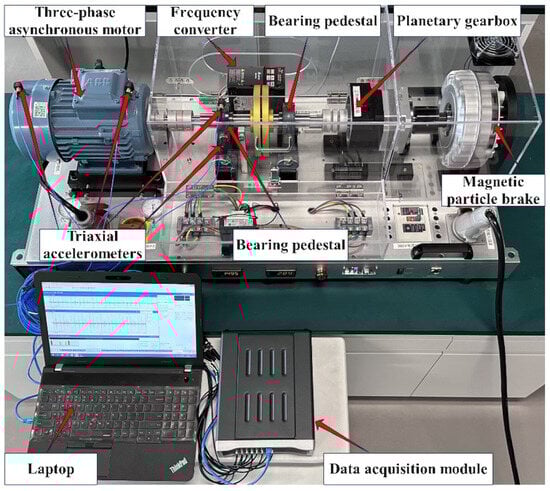 The motor dataset and the bearing dataset from Shenzhen Technology University (SZTU) are collected in our laboratory, as shown in Figure 6. The bearing and motor fault simulation experiment is conducted using the PT600, which consists of a three-phase asynchronous motor, two bearing pedestals, a planetary gearbox, a frequency converter, and a magnetic particle brake. The magnetic particle brake provides a torque load of 0–50 N∙m and the speed of the motor can be adjusted via the frequency converter in a range of 0–1750 rpm.