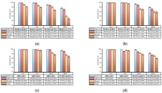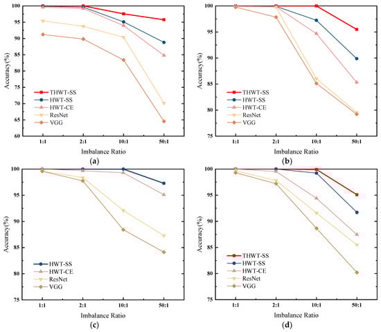 We continue to test all imbalanced ratios in the CWRU, SEU, and SZTU-B datasets. The average accuracy of the transfer tests for each imbalanced ratio is calculated and compared to other models. From the comparison results shown in Figure 16, it is clear that THWT-SS has advantages over other models without PTL, which proves the feasibility of mutual transfer learning between different RM components. As a special case, the proposed HWT-SS is sufficient to handle various imbalanced ratios in the SZTU-M dataset, reflecting the advantage of the seesaw loss function in handling imbalanced data.
