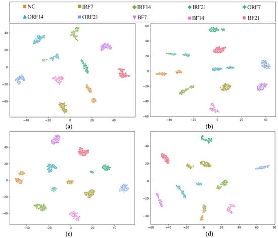 Visualizations of the feature vectors extracted from the CWRU test dataset using (a) HWT-SS, (b) HWT-CE, (c) ResNet, and (d) VGG.