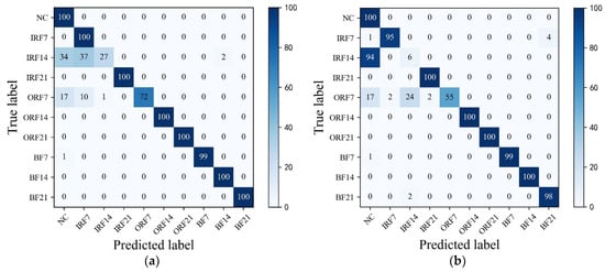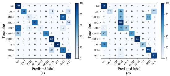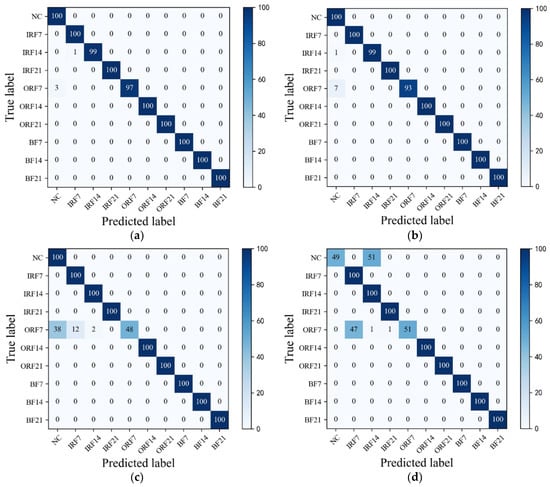 As can be seen in Figure 9a, HWT-SS has the lowest misclassification; only three ORF7 samples are misclassified as NC, and the accuracy of HWT-SS for the NC label is at most 97.09%. In HWT-CE and ResNet, there are 7 and 38 ORF7 samples misclassified as NC labels, respectively (see Figure 9b,c), and the NC accuracy is 92.59% and 72.46%, respectively. VGG performed the worst with 51 and 49 prediction errors for NC and ORF7, respectively.