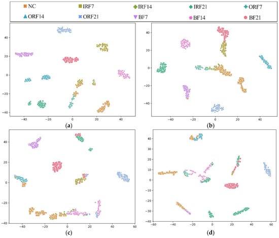 Visualizations of feature vectors extracted from the CWRU test dataset using (a) HWT-SS, (b) HWT-CE, (c) ResNet, and (d) VGG.