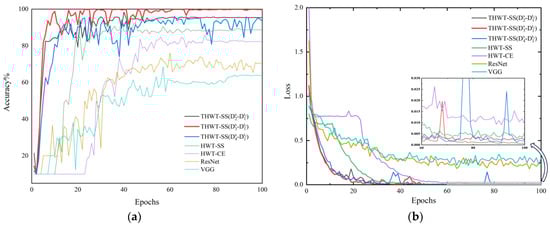 Finally, it is necessary to further evaluate the diagnostic performance of the proposed method compared with the published methods; the comparison results running under the same CWRU dataset are listed in Table 11. All models were compared under similar imbalanced ratios: Refs. [,] contain 12 fault classes under a single operating condition; Ref. [] only has 5 fault classes under a single operating condition; and Ref. [] has 10 fault classes under three mixed operating conditions. From the perspective of model diagnostic accuracy, the proposed THWT-SS achieves the highest accuracy of 100% under the most complex operating conditions. HWT-SS is only 0.04% worse than Ref. [], ranking third, but it has an additional operating condition, which reflects the powerful performance of the seesaw loss function used in this paper.