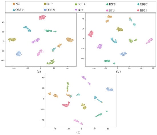 T-SNE visualization results of (a) , (b) , (c) transfer tests across the THWT-SS.