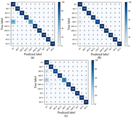 The confusion matrixes of (a) , (b) , (c) transfer tests over the THWT-SS.