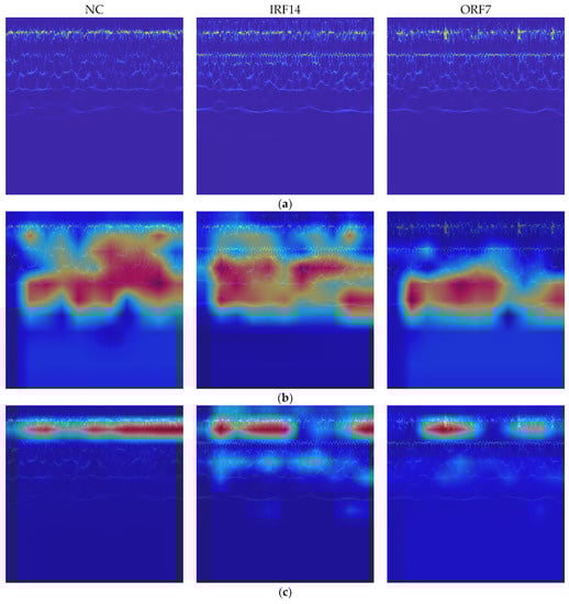 Grad-CAM heatmaps of (a) original samples, (b) HWT-SS and (c) THWT-SS () model for NC, IRF14 and ORF7 label samples.