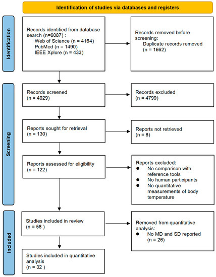 The structure of the content below follows the Preferred Reporting Items for Systematic Reviews and Meta-Analyses (PRISMA) guidelines [12]. A systematic literature search was conducted in multiple databases, including the Web of Science Core Collection, PubMed, and IEEE Xplore, to identify studies published before 31 March 2023 that reported the use of non-contact infrared body temperature measurement methods. The following keywords and search terms were used: