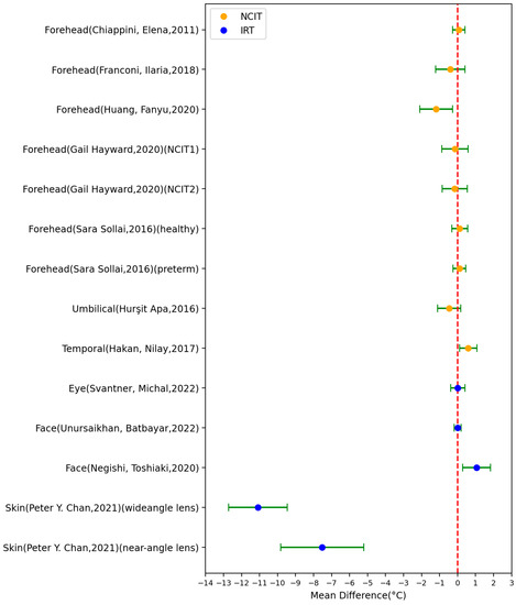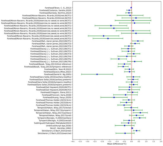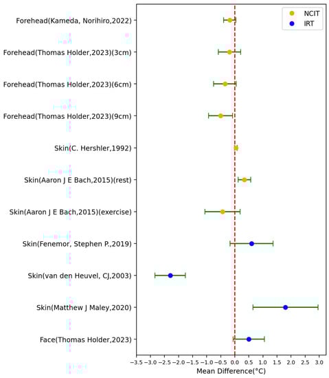 Among the included studies, 11 studies (comprising of 14 settings) used axillary temperature as the reference body site, employing both digital or mercury thermometers (Figure 4). Out of these 14 settings, 6 had an MD > 0 °C, 1 had an MD = 0 °C, and the remaining 7 had an MD < 0 °C. The IRT study conducted by Unursaikhan Batbayar demonstrated the best MD and SD [37]. This study was conducted at the Central Hospital of Songinokhairkhan District in Mongolia; although the environmental temperature was not reported, the experiment was carried out under stable clinical conditions. The study included a group size larger than 100, with both male and female participants. The region of interest for body temperature was extracted using camera image processing algorithms. Conversely, the two settings of the IRT study conducted by Peter Y. Chan exhibited the worst MD and SD [45]. In this study, the software correcting a fixed offset was not used intentionally, resulting in a deviation greater than 7 °C.