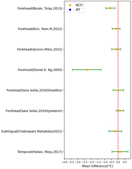 In seven studies (comprising eight settings), the reference temperature was measured using tympanic thermometers (Figure 5). Among these eight settings, three had an MD > 0 °C and five had an MD < 0 °C. One setting of the NCIT study conducted by Sara Sollai had the best MD and SD. This particular setting involved 70 pre-term newborns (28 boys and 42 girls) and was carried out in incubators [35]. On the other hand, the NCIT study conducted by Daniel K. Ng had the worst MD and SD [29]. This study was conducted at Kwong Wah Hospital and included 567 patients aged between 1 month and 18 years old.