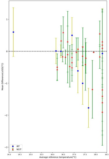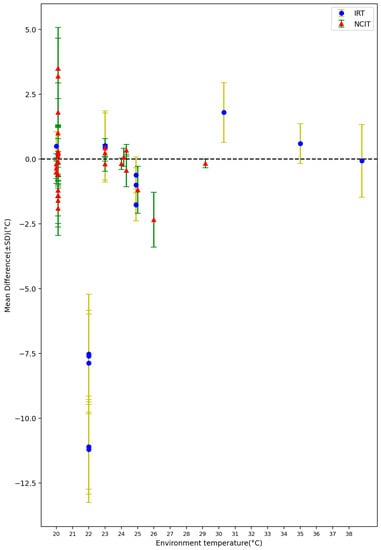 Our results show that the accuracy of NCITs is slightly better than that of IRT, although the gap is not very large. Generally, NCITs have a shorter effective distance and are less affected by external factors than IRT. Although, NCITs often exhibit higher accuracy and reliability compared to IRT, IRT still has its own unique advantages. IRT can be used to quickly screen the body temperature of large groups of people. For example, Armote Somboonkaew’s research shows that IRT can screen the body temperature of nine people simultaneously at a speed of eight frames/second [49]. A correlation coefficient of 0.731 was found between IRT and forehead skin thermometers. It achieves 100% sensitivity and 92.6% specificity under the cutoff value of 37.5 °C. Sun deployed thermal imagers at airports for body temperature screening, testing 617,289 individuals, with a mean difference of 2.7 °C [50].
