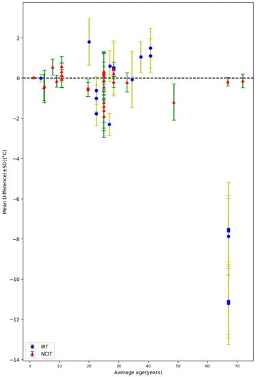 Furthermore, our results suggested a potential relation between the MD and the average age of subjects, especially for NCITs. Despite variations in settings and devices, both younger groups (average age < 20 years) and elder groups (average age > 50 years) showed better accuracy levels than groups with an average age ranging from 20 to 50 years. However, An V. Nguyen demonstrated that the differences between readings of NCITs and the oral reference temperature for older people were larger than those obtained for younger people [60]. This divergence underscores the importance of continued research within this area. Further investigations should be conducted to elucidate the underlying factors responsible for these variations and to optimize the accuracy of non-contact thermometers across all age groups. This would not only aid in a clearer understanding of the age-related nuances of temperature readings, but also guide clinicians in making more informed decisions based on NCIT measurements.