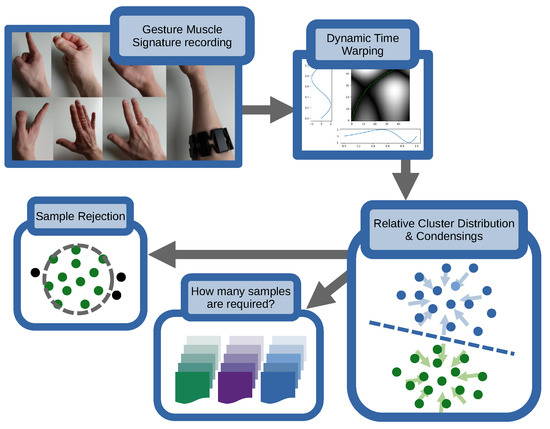 Figure 1. Visualization of the work presented. The (top left) indicates gestures recorded, which are compared via Dynamic Time Warping in the (top right). This then allows the assessment of cluster distributions and cluster condensing (bottom right), which lays the foundation for investigations such as the number of samples required and sample rejection (bottom left).
