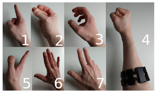 22. Benalcázar, M.E.; Motoche, C.; Zea, J.A.; Jaramillo, A.G.; Anchundia, C.E.; Zambrano, P.; Segura, M.; Benalcázar Palacios, F.; Pérez, M. Real-time hand gesture recognition using the Myo armband and muscle activity detection. In Proceedings of the 2017 IEEE Second Ecuador Technical Chapters Meeting (ETCM), Salinas, Ecuador, 16–20 October 2017; pp. 1–6. [Google Scholar] [CrossRef]