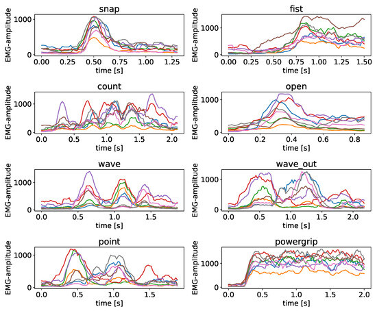 Figure 3. Sample recordings of the seven gestures as well as the powergrip as an 8-dimensional EMG recording. As we are only performing a comparison analysis here, the y-axis depicts the intensity units returned directly by the Myo hardware, and each line corresponds to the output of one of the 8 sEMG sensors that provide simultaneous measurements, color consistent over different plots.