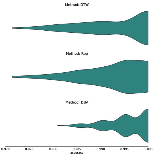 With classification accuracies solidly above 97%, this can be confirmed clearly and straightforwardly, both for the uncondensed approach as well as for the more computationally efficient, condensed approaches, especially the DBA condensation.