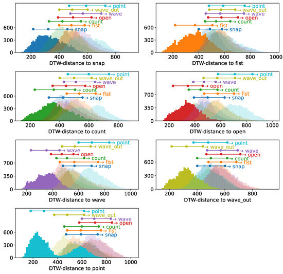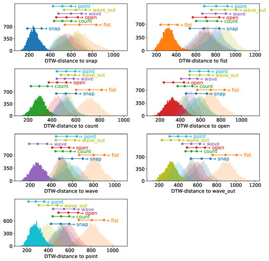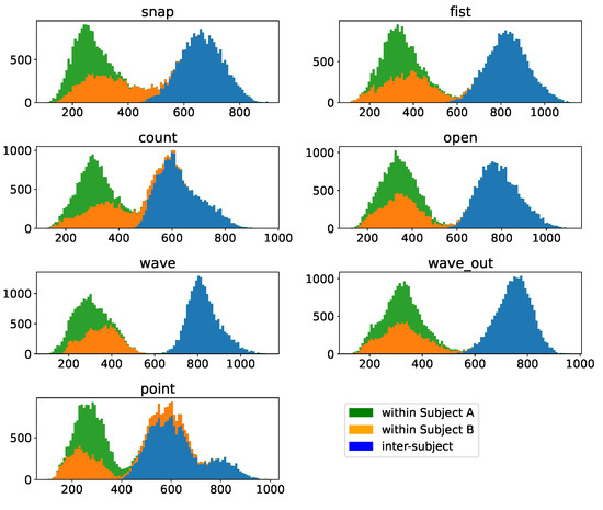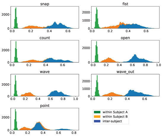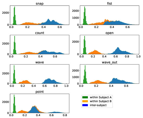 Figure 16. Pairwise DTW distances of clusters per gesture within- as well as inter-subject based on batch-normalized samples. The within-subject distances are pairwise distances of samples of the denoted gesture with all other samples of this sample as well as subject. The inter-subject data indicate pairwise distances between samples of the same gesture but different subjects. The total histogram consequentially indicates the pairwise distances per gesture after merging the sample sets of both subjects.