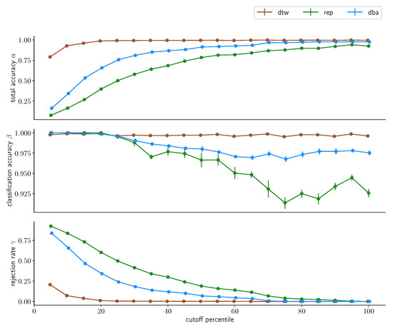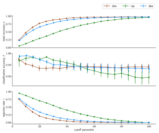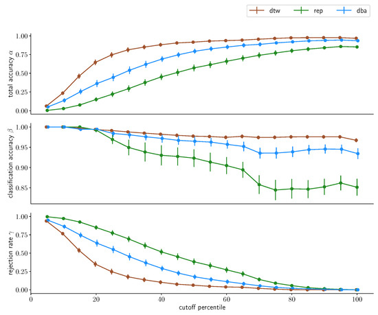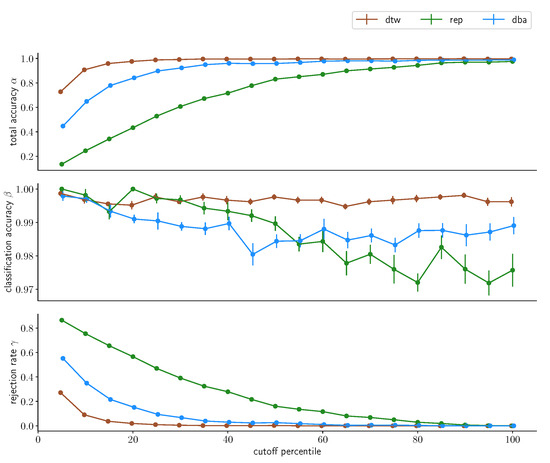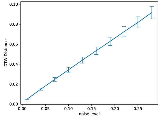 To obtain a Dynamic Time Warping distance estimate, two sequences X = ( x 1 , , x N ) , Y = ( y 1 , , y M ) from a feature space F, s.t., ( x n , y m ) F × F with n [ 1 , N ] N , m [ 1 , M ] N , are compared. The warping path is then a sequence p = ( n l , m l ) of length L, mapping elements from X and Y onto each other, with p 1 = ( 1 , 1 ) and p L = ( N , M ) to ensure the endpoints of X and Y match and respecting monotonicity ( n 1 n l n L and m 1 m l m L for 0 l L for each sequence of tuples ( n , m ) ) which is required to ensure that sequences will not be warped backwards. We further define a cost function c : F × F R 0 that determines a pairwise cost between points of two sequences. This then allows us to associate a cost with each warping path as c p ( X , Y ) = l = 0 L c ( x n l , y m l ) . An optimal warping path p * is then the warping path with the mininimal associated cost, i.e., p * : = min ( p ) ( c p ( X , Y ) ) and the DTW distance of those two series is then c p * . DTW can be used to implement a kNN-classifier for time series data that can yield state-of-the-art classification performance and has been used this way in the past in a variety of applications [42,43].