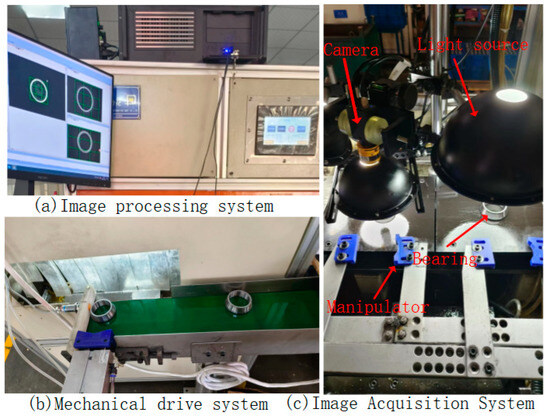 The bearing defect visual inspection device designed and developed in this study, as shown in Figure 1, consists of three main parts: mechanical transmission, machine vision, and electrical control. The mechanical transmission section is composed of a frame, motor, belt, and cylinder, which transports the bearings to various inspection stations. The machine vision section is composed of an industrial camera, vision light source, industrial computer, and inspection system software, which provides high-quality imaging of the transported bearings and achieves the precise and real-time detection of various defects. The electrical control section is composed of a PLC and photoelectric sensors, which trigger the industrial camera and vision light source and reject defective products. Table 1 shows the system equipment models.