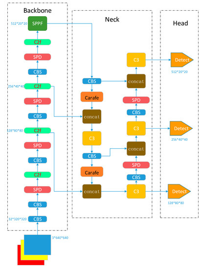 In this paper, we use the SPD module to replace the previous Conv layer for downsampling, which increases the number of channels in the feature maps. The ability to detect low-resolution images and small objects is improved while maintaining the resolution of the feature map, which improves the model expression and generalization ability. Additionally, a C2f module is utilized to extract features. In contrast to the C3 module, C2f uses separable convolution and concatenation operations to enable the fusion of feature maps with different numbers of channels. In the neck, we employ CARAFE for upsampling, which preserves more detailed feature information and structural information, thereby improving the quality and accuracy of the upsampling operation.