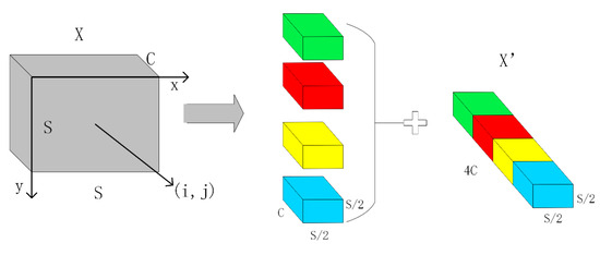 In general, given any original feature map X, a sub-map is formed by all the entries that and are divisible by scale. Therefore, each sub-map downsamples X by a factor of scale. When scale = 2, as shown in Figure 4, four sub-feature maps are obtained, each with a size of . Meanwhile, X is downsampled by a factor of 2, and the resulting sub-feature maps are concatenated along the channel dimension, resulting in a new feature map . The spatial dimensions of are one-fourth of X, while its channel dimension is four times that of X.