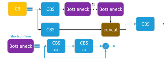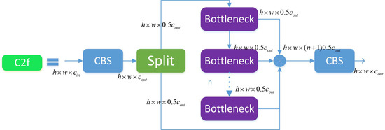 According to Figure 6, the size of the input feature map is . After passing through the CBS, the output size is . The output feature map is split into two sub-feature maps through the Split operation, and one sub-feature map is processed through n bottleneck modules. Meanwhile, each sub-feature map output by the bottleneck module is concatenated with a sub-feature map previously split by the Split operation. Finally, a CBS module is used to output a feature map with the same size as the input.