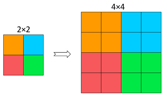 In YOLOv5, nearest-neighbor interpolation is used as the default upsampling algorithm. Nearest-neighbor interpolation is the simplest interpolation algorithm, which sets the grayscale value of the transformed pixel to the grayscale value of the input pixel that is closest to it. Nearest-neighbor interpolation is implemented through coordinate transformation, mapping each pixel point in the target image to the original image and then taking the grayscale value of the original image pixel nearest to the target image pixel as the grayscale value of the target image pixel, as shown in Figure 7. When an image is enlarged, each missing pixel is generated directly using the nearest existing color, which means copying the neighboring pixels. However, this method produces obvious jaggedness. Jaggedness, commonly referred to as “jagged artifacts”, is a common phenomenon in image processing and computer graphics. They typically occur when resizing images or performing pixel-level resampling. The primary cause of this distortion is insufficient image resolution or inadequate smoothing of image details during image upscaling or resizing. When an image contains sharp transitions or edges between regions, low-quality interpolation methods, such as nearest-neighbor interpolation, can lead to abrupt changes in pixel values. This can result in pronounced jagged edges between edges and regions.