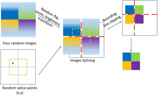 A loss function is a function used to calculate the difference between predicted values and true values. The smaller the value of the loss function is, the closer the predicted output is to the expected output [29]. In this study, the applied loss function is divided into three parts: classification loss, localization loss, and confidence loss. The classification loss is used to determine whether the anchor box and corresponding annotated classification are correct and represents the probability of belonging to a certain category. The localization loss is used to predict the error between the predicted box and the annotated box. The confidence loss is used to calculate the network’s confidence. It represents the probability of there being an object and typically has a value between 0 and 1, with larger values indicating a higher probability of there being an object. The overall loss function is a weighted sum of these three loss functions, as expressed in Equation (7):
