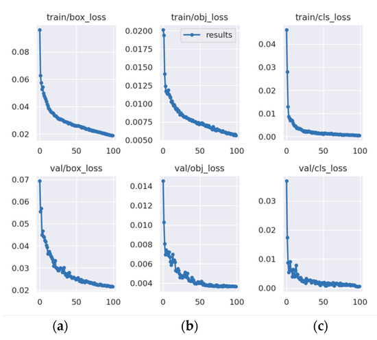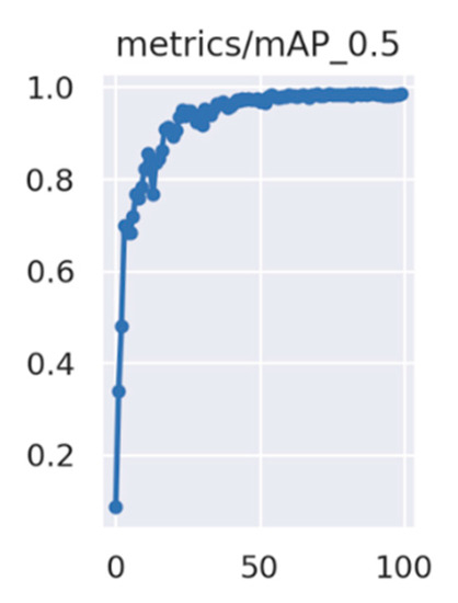 Figure 11 shows that the training and validation loss converged quickly within the first 30 training epochs and converged completely when the number of training epochs reached 100. Figure 12 shows that the mAP increased as the number of training epochs increased.
