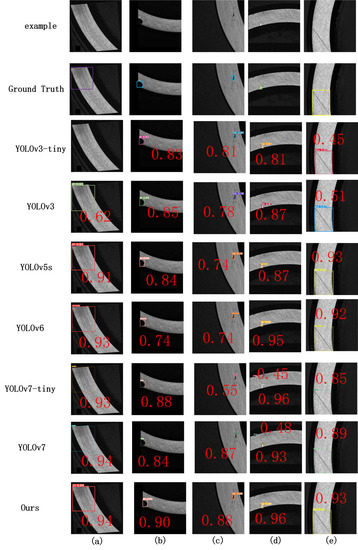 Test results on the bearing defect dataset for different models. (a) Helical marks; (b) forging waste; (c) black spots; (d) dents; and (e) scratches.