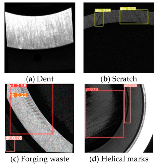 A scratch defect, shown in the red box of Figure 2e, is a surface defect with a certain depth that appears as a linear scratch and is mainly caused by the processing, loading, unloading, and measurement of the workpiece. The color is usually black, with a size of 0.1 × 0.1 mm or more.