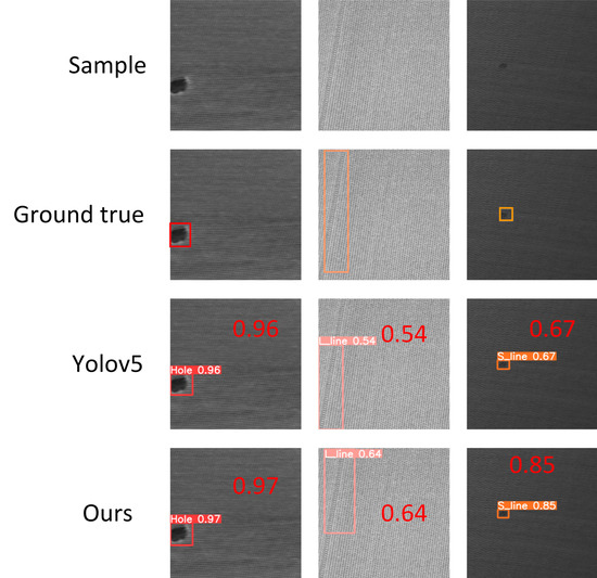 To further evaluate the performance of the improved algorithm proposed in this study, we conducted comparative experiments on a fabric dataset. Following the experimental method used to detect surface defects on bearings, we first augmented a collected fabric dataset. Each fabric image was of size 400 × 400, and there were a total of 878 images. The dataset was expanded to 3317 images by applying horizontal flipping, brightness variation, and other methods. Then, the dataset was divided into training, validation, and testing sets at a ratio of 6:2:2. A comparison with YOLOv5 is shown in Figure 14, and a comparison with other algorithms is shown in Table 10.