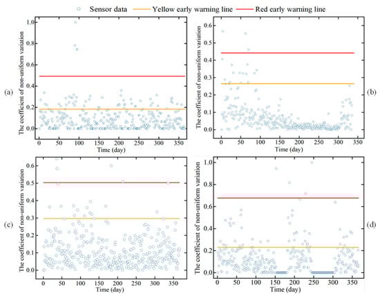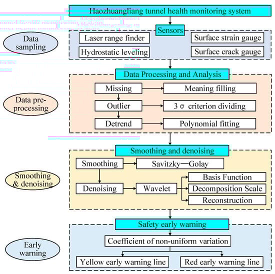 Firstly, for missing values, the average value of the time-series data is used for filling, assuming that small portions of data change do not affect the overall trend. Secondly, the 3σ rule is proposed to handle the outliers, indicating overly large or small data that need to be cleaned. Next, polynomial fitting is adopted to remove signal trend terms affected by seasonal and environmental factors. Then, in signal smoothing, Savitzky–Golay smoothing (SGS), moving average smoothing, and five-point cubic smoothing are used to smooth spikes existing in signals. In comparison, SGS is adopted when it shows better performance than others. Enumeration is utilized to select optimal parameters of SGS. Furthermore, to optimize wavelet denoising effects, wavelet transform is proposed to denoise data by selecting suitable wavelet basis functions and decomposition levels. Finally, the non-uniform variation coefficient method calculating the gray correlation degree between sensor signals is utilized. That is used to infer early warning situations of monitoring items. The flowchart of the organization for this study is shown in Figure 1.