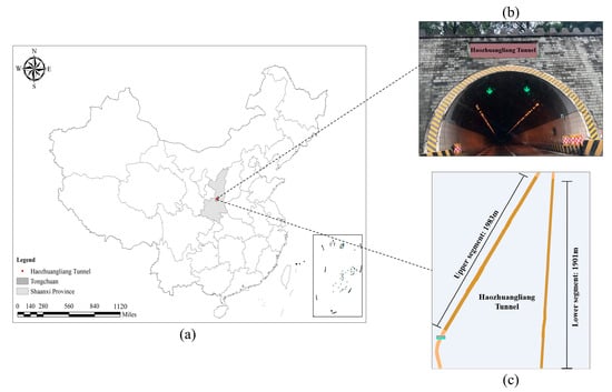 The location and composition of the Haozhuangliang tunnel. (a) Location and composition. (b) Haozhuangliang Tunnel. (c) Dimensions.