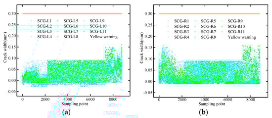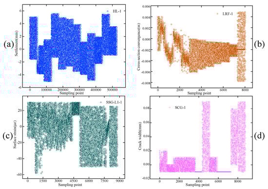 There are four types of monitoring: settlement, cross-section convergence, lining surface stress, and crack width. (1) Settlement monitoring. It is measured with hydrostatic leveling at nine monitoring sites every 200 m, with problematic sections located every 50 m. Data are collected once a minute, for 527,040 data points per year. (2) Cross-section convergence. A total of 32 laser range finders are deployed to monitor this content, with regular and problematic sections located at intervals of 200 and 50 m, respectively. The collection frequency is once an hour, with a total of 8041 data. (3) Lining surface stress. It is monitored using 131 surface strain gauges, with intervals following the same pattern as for settlement monitoring. There are five cross-sections per section, and 27 monitoring sites on the left and right sides. (4) Lining surface crack width. It is observed through 22 surface crack gauges, with one sensor selected for 25% of the total cracks. Data are collected once an hour for a total of 8785 data points.
