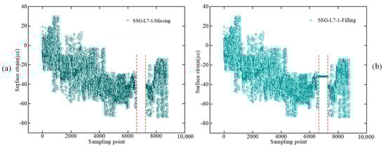 Sensors may contain missing values due to various factors, such as power supply disruptions, maintenance checks, and other ambient factors. To facilitate further analysis, filling in these missing values is essential. The absence data of some sensors is appended in Table A1. Figure 4 shows the missing value of SSG-L7-1, “L” represents tunnel left, resulting in 744 missing values for each sensor. In comparison, SSG-R (SSG installed on the right side) exhibits no missing data, indicating that it has a higher quality of data concerning missing values. The leading causes of the missing data could be sensor failure or transmission network issues. This led to no data being collected for that month. The mean filling was utilized to fill in the missing values to reduce the amount of computational load and the effects of data variance. The filling result is shown in Figure 4, and the red dashed lines in Figure 4 indicate the extent of missing and filling, where (a,b) shows the missing and the filling of SSG-L7-1, separately.