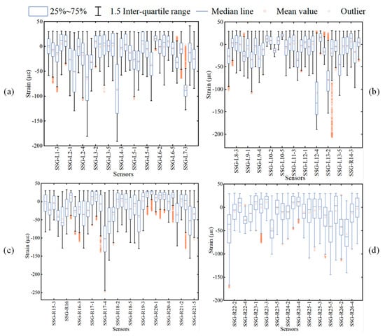 The box plot of SSG sensors. (a) S1–S7; (b) S7–S14; (c) S15–S21; and (d) S22–S26.