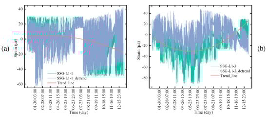 SSG-L1-1 and SSG-L1-1 detrending vs. original data. (a) SSG-L1-1, (b) SSG-L1-3.